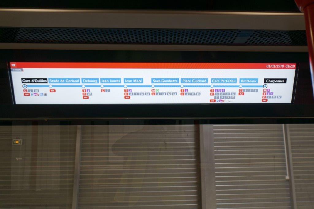 Thermomètre de la ligne B du métro de Lyon photographié à l’intérieur de la première rame MPL 16 Alstom, le lundi 27 mai 2019. La date affichée en haut à droite du thermomètre nous rajeunit de 49 ans. Copyright : Yvon Brument