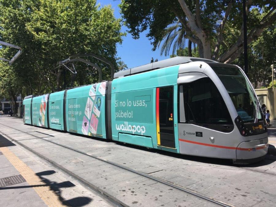 A Séville, la rame 302 Urbos 3 CAF est photographiée au terminus « Plaza Nueva », le dimanche 26 mai 2019. Copyright : Christophe Clément