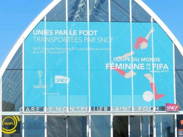 A la gare de Montpellier Saint-Roch, la SNCF, Supporter National de la Coupe du Monde Féminine de la FIFA, France 2019, affiche la couleur sur la façade de la gare centrale montpelliéraine, côté Pont-de-Sète.