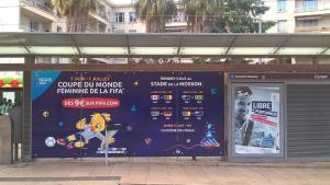 - Un abri de la station « Corum », commune aux lignes 1, 3 et 4 de tramway, aux couleurs de la Coupe du Monde Féminine de la FIFA, France 2019, photographié le samedi 25 mai 2019. Copyright : Edouard Paris
