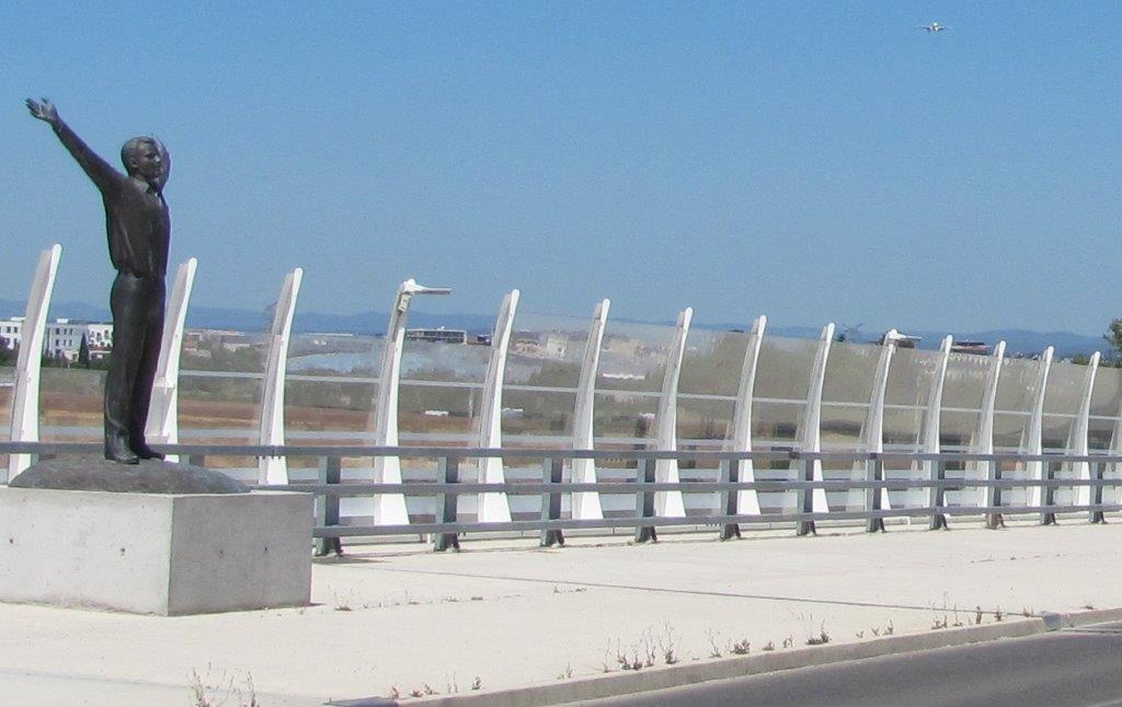La statue de Youri Gagarine, érigée sur le pont éponyme, va saluer le passage à basse altitude du premier vol commercial Moscou – Montpellier opéré par la compagnie russe Ural Airlines, le dimanche 2 juin 2019 à 12h30. Les phares d’atterrissage de l’Airbus A319-112 sont perceptibles en haut à droite de la photo. Copyright : Edouard Paris
