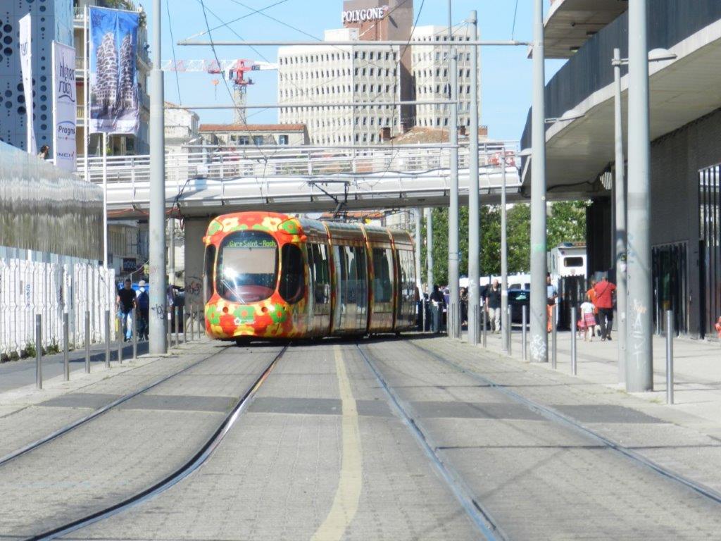 Dans l’impossibilité d’aller au-delà du Pont-de-Sète, une rame Citadis 302 Alstom, opérant sur la ligne 2, manoeuvre rue Alexandra David-Néel à Montpellier pour retourner vers la station « Rondelet », le samedi 8 juin 2019 à 16h57, acte XXX des gilets jaunes. Copyright : Anje34