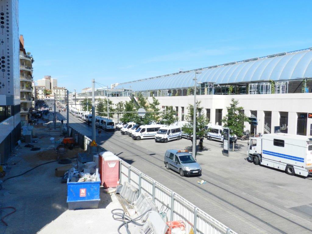 Nombreux étaient les véhicules de CRS stationnés au pied de la gare de Montpellier Saint-Roch, le samedi 8 juin 2019 à 17h05, acte XXX des gilets jaunes. Copyright : Anje34