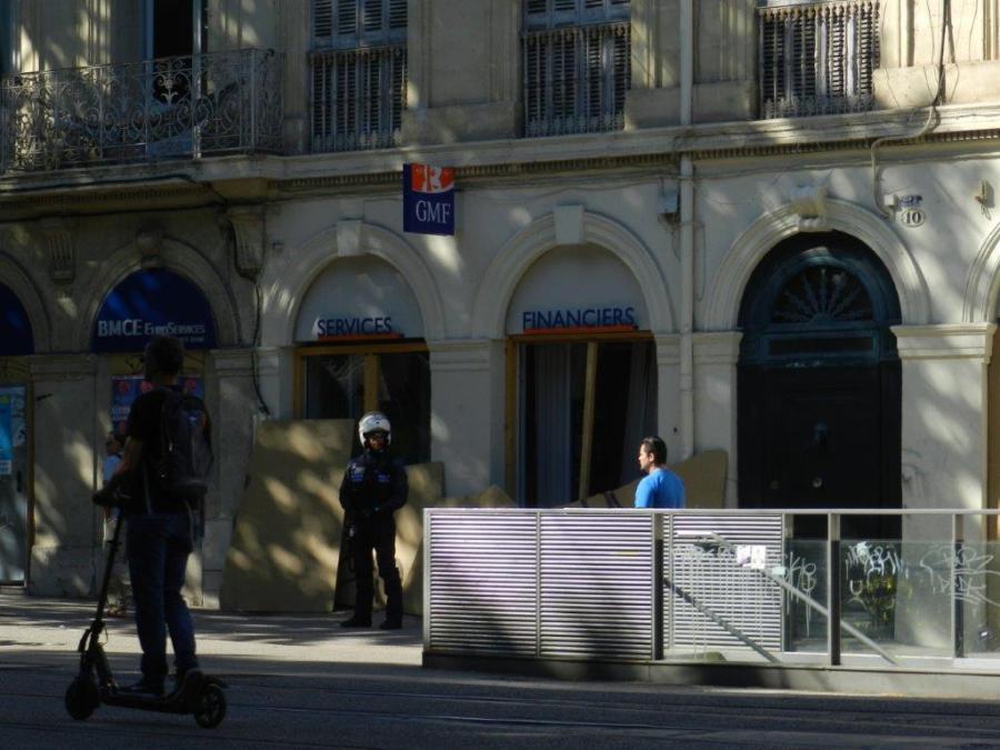 Cours Gambetta à Montpellier, des vitrines de l’agence GMF ont été vandalisées par des casseurs en marge de la manifestation des gilets jaunes du samedi 8 juin 2019. Photo prise à 17h38. Copyright : Anje34