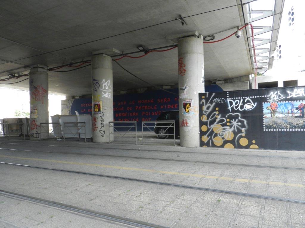 Sous le Pont-de-Sète à Montpellier, aperçu de l’œuvre « Le Triomphe de Gilgamesh » signée Dominique Figarella, tout près des voies du tronc commun des lignes 2 et 4, le vendredi 7 juin 2019 à 10h13. Copyright : Anje34