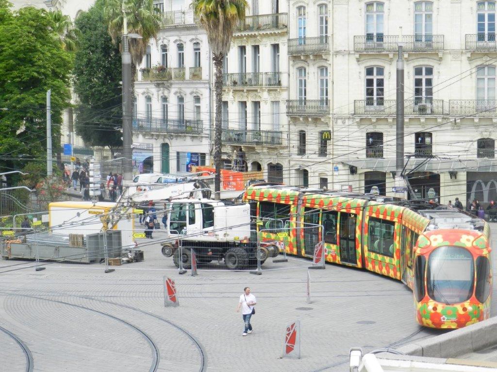 Vue sur la place Auguste-Gibert à Montpellier, où des engins de travaux de rénovation de la voie ferrée sont parqués face au square Planchon, le mardi 11 juin 2019. Copyright : Anje34