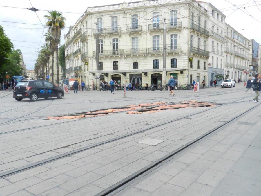 Des travaux de rénovation de la voie ferrée ont été entrepris dans la nuit du 10 au 11 juin 2019 sur la place Auguste-Gibert à Montpellier, carrefour stratégique des quatre lignes de tramway. Photo prise le mardi 11 juin 2019. Copyright : Anje34