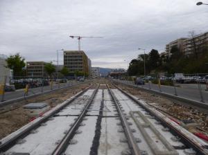 - A Nice, travaux de pose des voies de la ligne 3 de tramway entre les futures stations « Eco-Parc » et « Stade ». Photo prise le samedi 6 avril 2019. Copyright : Michel Bozzola