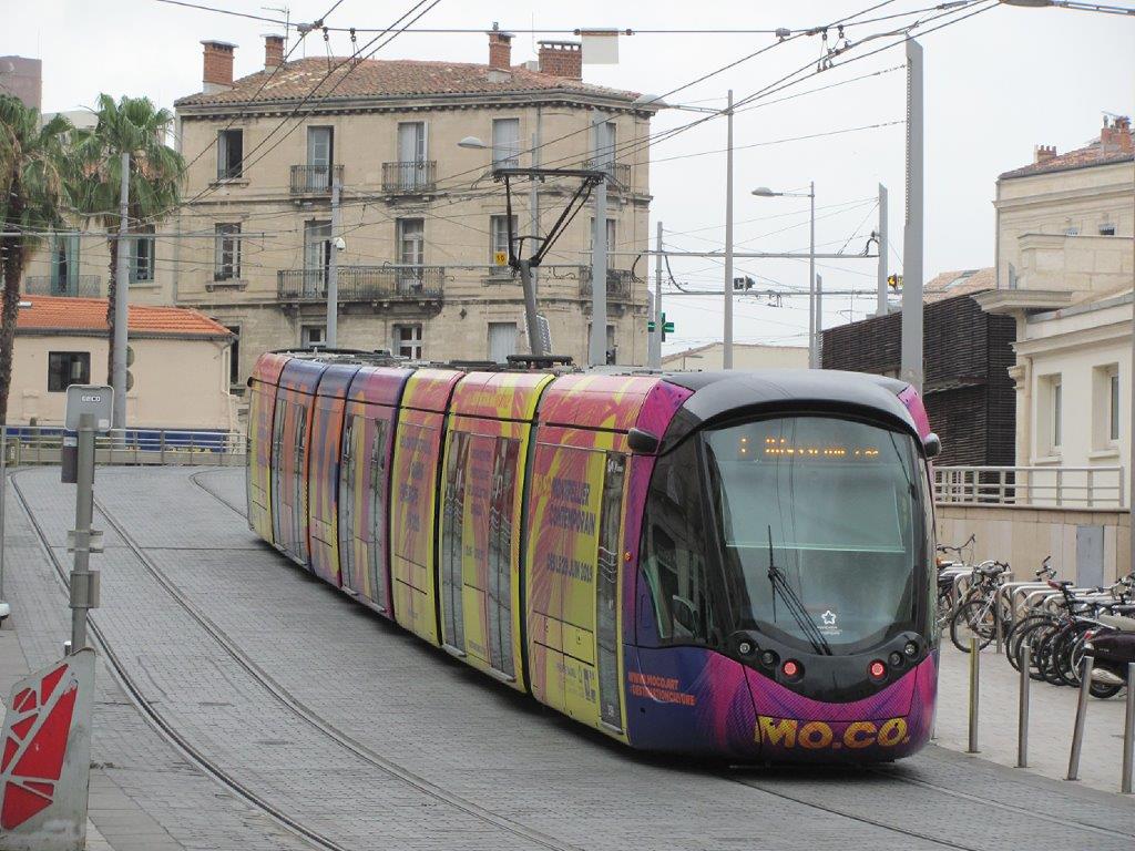 La rame 2099 Citadis 402 Alstom multiligne, circulant sur la ligne 1 de tramway, a revêtu les couleurs du MOCO. Photo prise rue Jules-Ferry à Montpellier, le samedi 15 juin 2019. Copyright : Edouard Paris