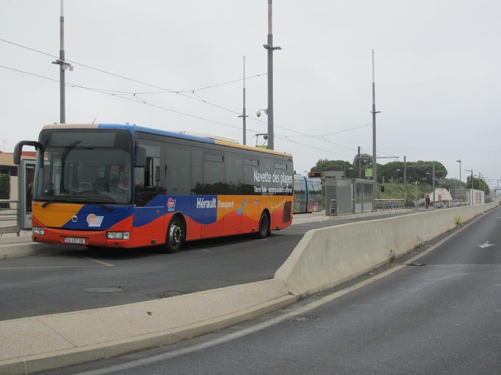 La première navette des plages de la saison estivale 2019, assurée par Hérault Transport, va quitter le terminus « Pérols – Etang de l’Or » en direction de la plage du Grand Travers à l’est de Carnon, le samedi 15 juin 2019 à 10h05. Photo prise le même jour à 10h01. Copyright : Edouard Paris