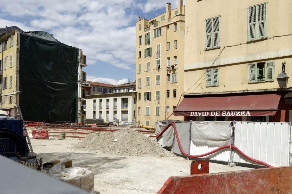 A Nice, photo prise à l’angle de la rue Catherine-Ségurane et de la rue Antoine-Gautier, où une partie d’un immeuble a dû être démolie dans le cadre des travaux de la ligne 2 de tramway, le jeudi 6 juin 2019. Copyright : Yvon Brument