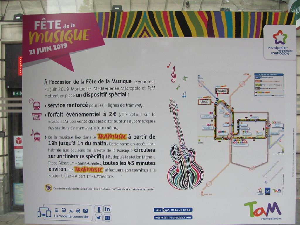 Mode d’emploi et itinéraire du TraMusic devant circuler le vendredi 21 juin 2019 au soir de la Fête de la Musique. Photo prise à la station « Gare Saint-Roch » des lignes 3 et 4, le samedi 15 juin 2019. Copyright : Edouard Paris