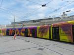 - Vue partielle de la rame 2099 Citadis 402 Alstom multiligne aux couleurs du MOCO, opérant sur la ligne 3, place Auguste-Gibert à Montpellier, le mercredi 19 juin 2019. Copyright : Anje34