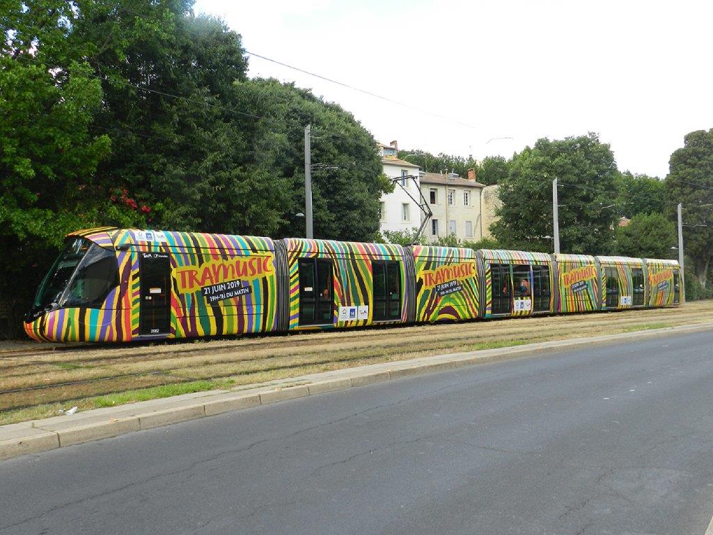 La rame 2082 Citadis 402 Alstom aux couleurs du TraMusic est photographiée sur la voie en tiroir parallèle aux voies de la ligne 1, avenue Saint-Charles à Montpellier, le vendredi 21 juin 2019. Copyright : Anje34