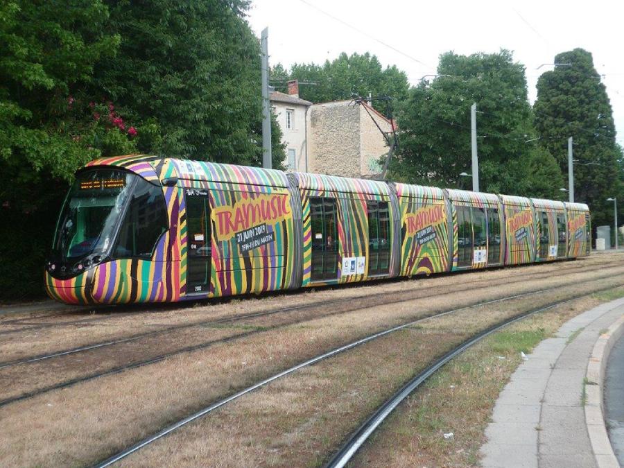 Autre photo de la rame 2082 Citadis 402 Alstom pelliculée TraMusic, sur la voie en tiroir de l’avenue Saint-Charles à Montpellier, le vendredi 21 juin 2019. Compyright : Edouard Paris