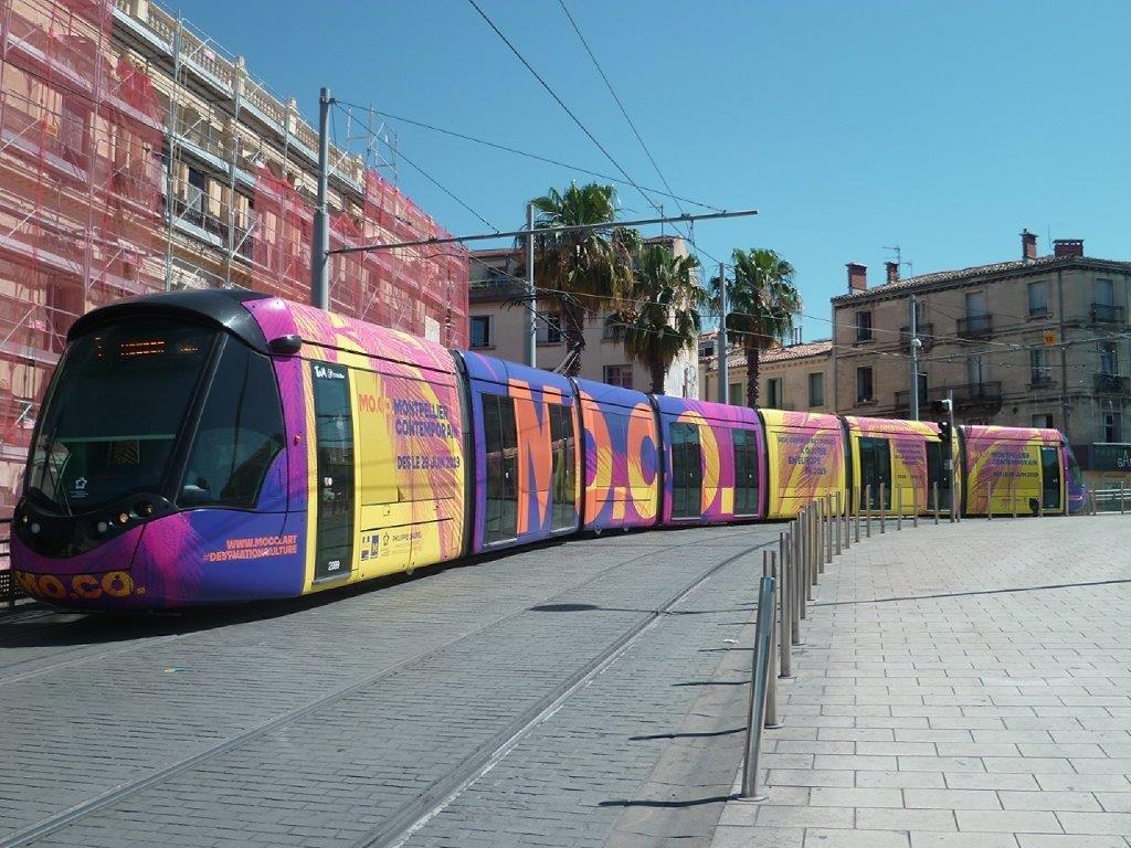 La rame 2099 Citadis 402 Alstom multiligne, aux couleurs du MOCO, est photographiée rue Jules-Ferry à Montpellier, le samedi 22 juin 2019. Copyright : Edouard Paris