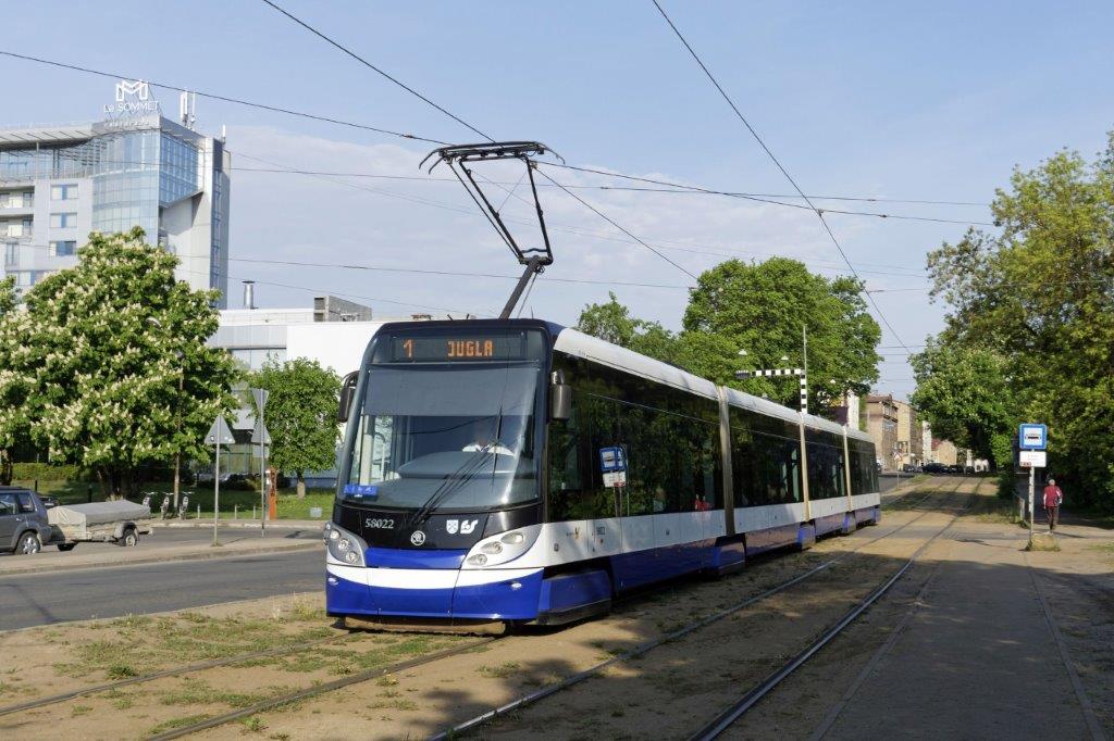 A Riga, la rame 58022 ForCity Alfa 15T1 Škoda (année 2012), opérant sur la ligne 1, est photographiée sur le boulevard Alexandra-Grina, le samedi 18 mai 2019. Copyright : Yvon Brument