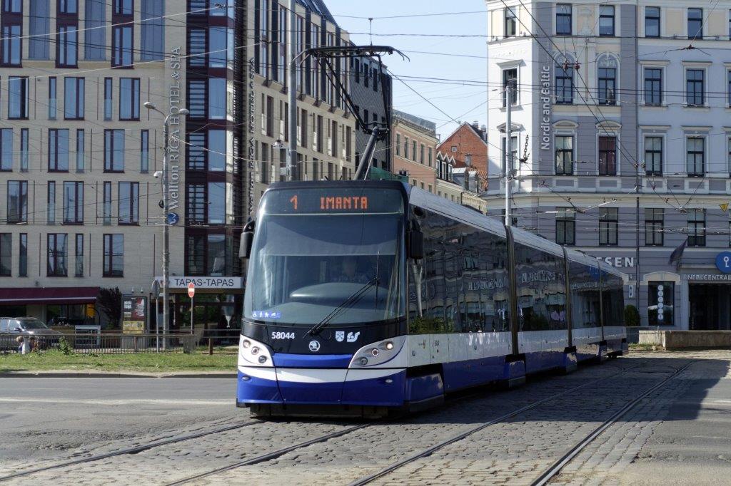 A Riga, la rame 58044 ForCity Alfa 15T1 Škoda (année 2012), opérant sur la ligne 1, est photographiée au moment où elle va traverser l’artère dénomée « 13 .janvara iela », le samedi 18 mai 2019. Copyright : Yvon Brument