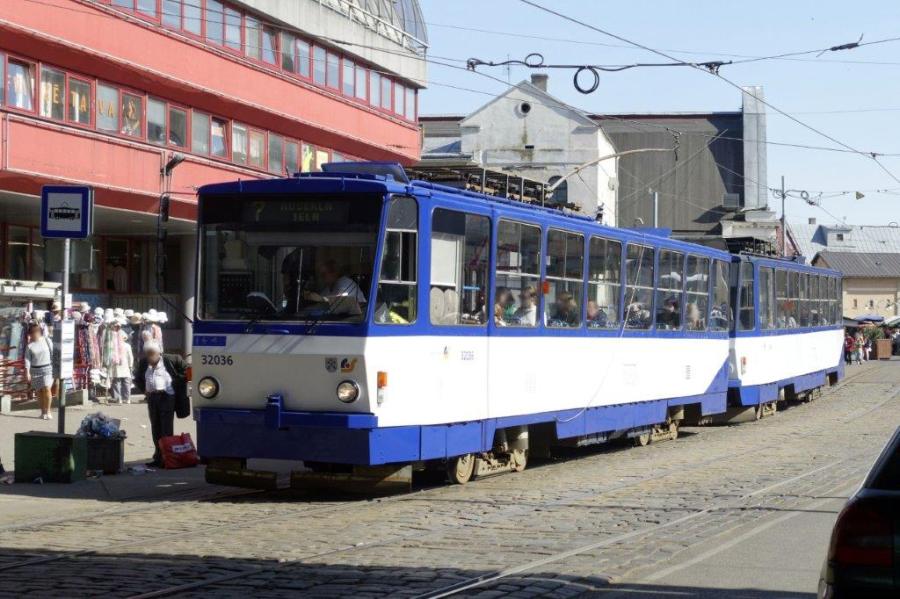 A Riga, un doublet de motrices de type T3MR (exT6B5SU) ČKD Tatra, opérant sur la ligne 7, motrice 32036 (année 1988) en tête, est photographié à la hauteur de l’arrêt « Pragas iela », le samedi 18 mai 2019. Copyright : Yvon Brument