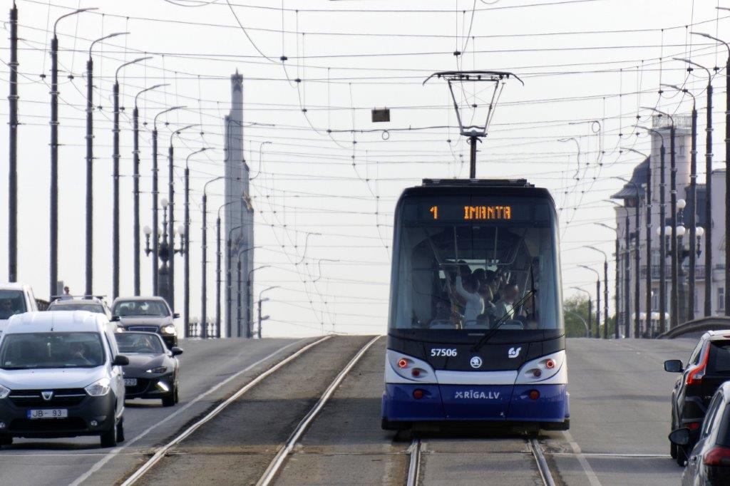 A Riga, zoom sur la voiture de queue de la rame 57506 Forcity Alfa 15T2 Škoda (année 2017), opérant sur la ligne 1, au moment où elle roule sur Akmens tilts (le pont de pierre), le samedi 18 mai 2019. Copyright : Yvon Brument