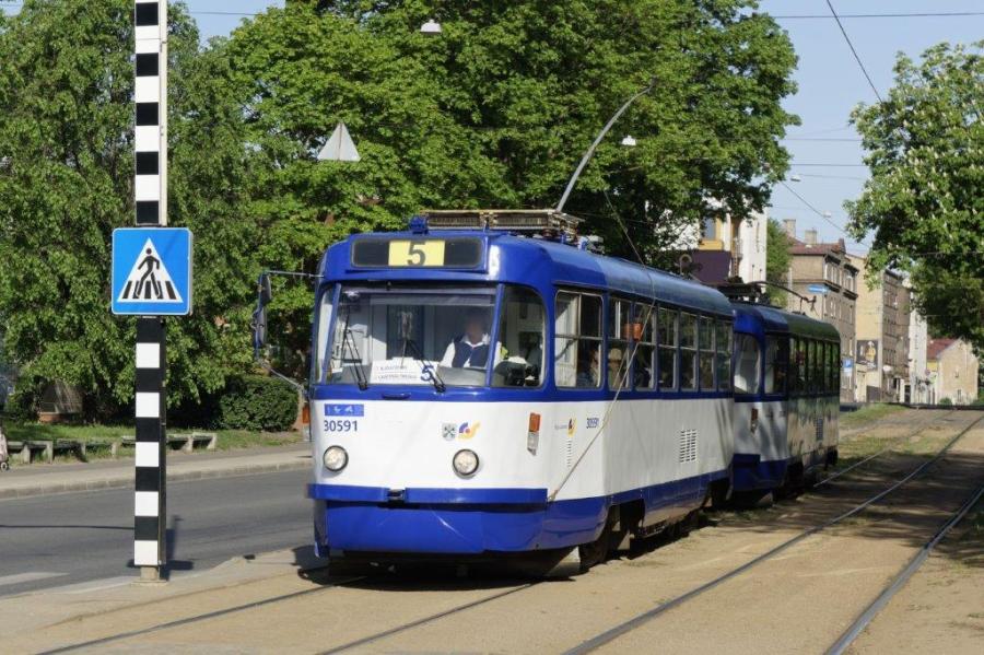A Riga, un doublet de motrices de type T3A (exT3SU) ČKD Tatra, opérant sur la ligne 5, motrice 30591 (année 1982) en tête, est photographié sur le boulevard Alexandra-Grina, le dimanche 19 mai 2019. Copyright : Yvon Brument