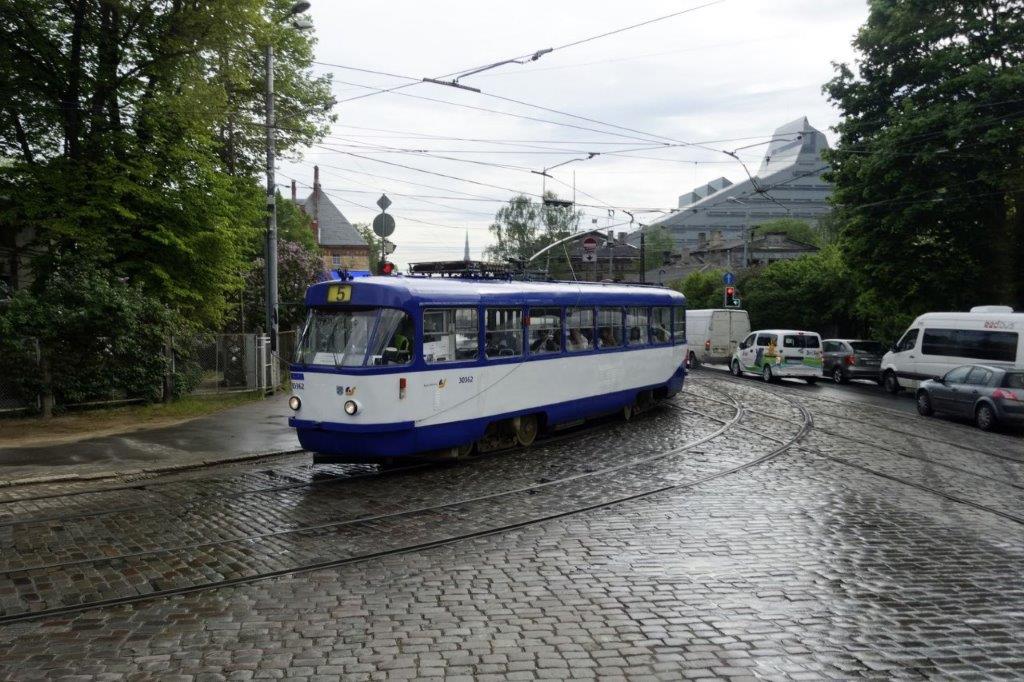 A Riga, la motrice 30362 T3A (exT3SU) ČKD Tatra (année 1983), opérant sur la ligne 5, est photographiée au moment où elle bifurque vers la rue Slokas, le lundi 20 mai 2019. Copyright : Yvon Brument