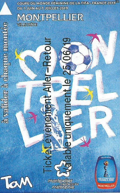 Ticket TaM Montpellier 3M collector événementiel édité le jour du cinquième et dernier match de la Coupe du Monde Féminine de la FIFA, France 2019, joué au Stade de la Mosson, le mardi 25 juin 2019