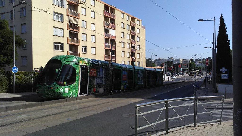 Ce vendredi 28 juin 2019, jour où le record absolu de chaleur a été enregistré à Montpellier avec 40,1° C, les rames du réseau de tramways auraient préféré rester à l’ombre. Sur la photo, prise à 9h40 le même jour, la rame 2049 Citadis 302 Alstom multiligne à la livrée « Montpellier Cité Jardins » circule sur la ligne 2 entre les stations « Mas Drevon » et « Croix d’Argent ». Copyright : Anje34