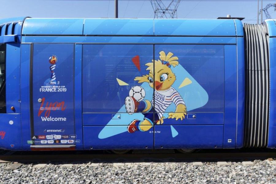 Gros plan sur la mascotte ettie appliquée sur une face latérale d’une motrice de la rame 884 Citadis 402 Alstom opérant sur la ligne T3 du réseau de tramways lyonnais. Photo prise le samedi 29 juin 2019. Copyright : Yvon Brument