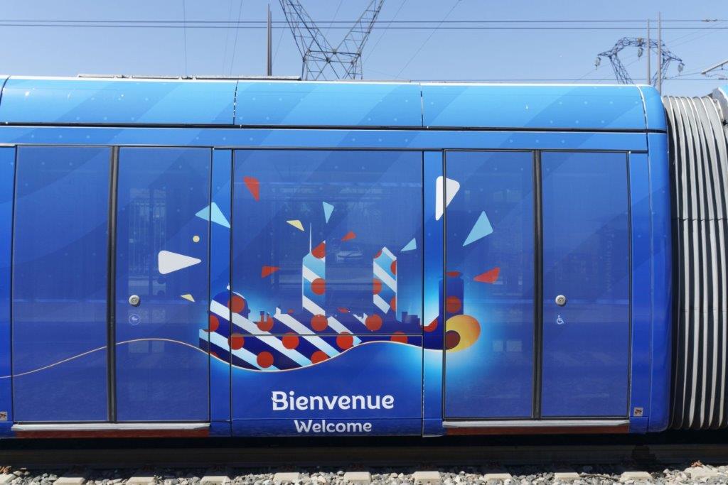 Autre décoration d’une face latérale d’un module de la rame 884 Citadis 402 Alstom aux couleurs de la Coupe du Monde Féminine de la FIFA, France 2019, photographiée le samedi 29 juin 2019. Copyright : Yvon Brument