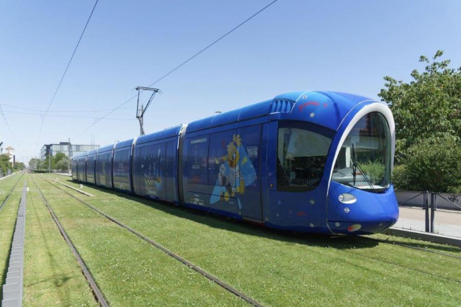 La rame 884 Citadis 402 Alstom aux couleurs de la Coupe du Monde Féminine de la FIFA, France 2019, circulant en direction de « Meyzieu Z.I. » est photographiée à la station « Gare de Villeurbanne » de la ligne T3, le samedi 29 juin 2019. Copyright : Yvon Brument