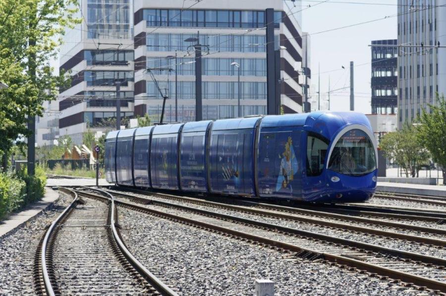 La rame 884 Citadis 402 Alstom aux couleurs de la Coupe du Monde Féminine de la FIFA, France 2019, est photographiée au moment où elle quitte la station « Vaulx-en-Velin – La Soie » de la ligne T3 en direction du terminus « Gare Part-Dieu – VIllette », le samedi 29 juin 2019. Cophyright : Yvon Brument