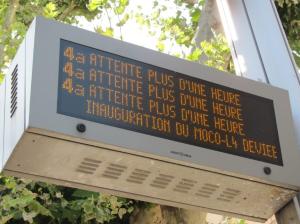 - Information donnée par un tableau électronique de la station « Louis Blanc » à Montpellier, le samedi 29 juin 2019 à 10h19. Copyright : Edouard Paris