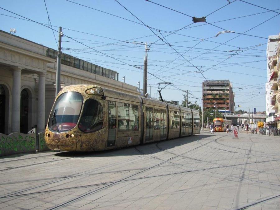 Inauguration du MOCO oblige, la boucle de la ligne 4 a été réduite de moitié dans les deux sens entre 8h et 15h le samedi 29 juin 2019. Sur la photo prise à 11h08, la rame 2044 Citadis 302 Alstom, circulant dans le sens a, prend la direction du Pont-de-Lattes au lieu de la rue de la République fermée à toute circulation. Copyright : Edouard Paris