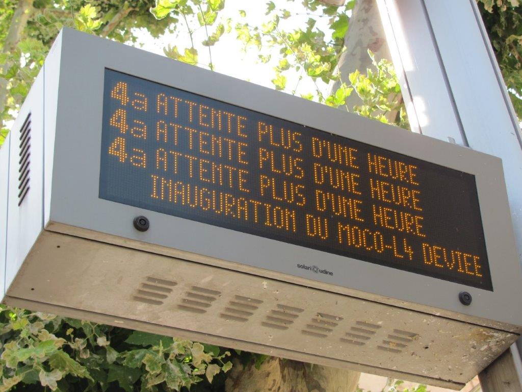 Information donnée par un tableau électronique de la station « Louis Blanc » à Montpellier, le samedi 29 juin 2019 à 10h19. Copyright : Edouard Paris