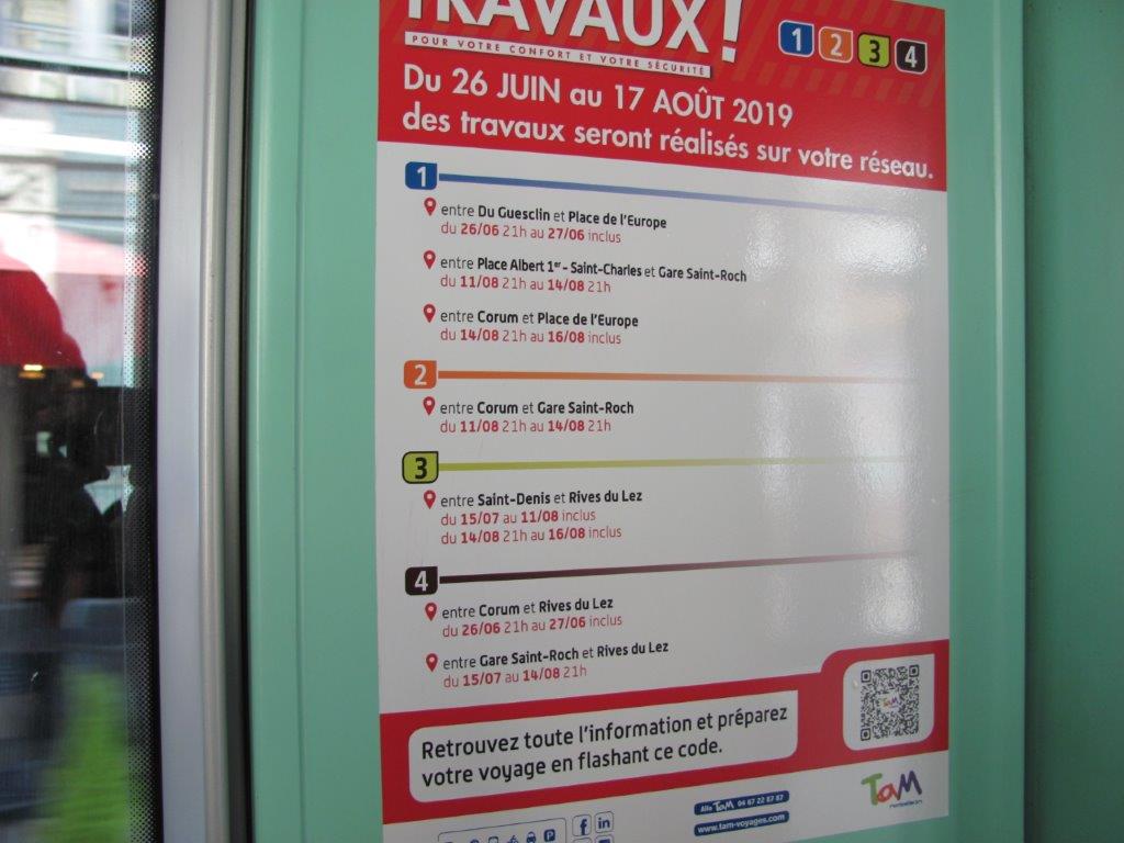 Calendrier des travaux de rénovation de la voie ferrée de l’été 2019 sur le réseau de tramways de Montpellier consultable dans les rames de tramways, comme ici dans la rame 2075 Citadis 402 Alstom opérant sur la ligne 3. Photo prise le samedi 29 juin 2019. Copyright : Edouard Paris