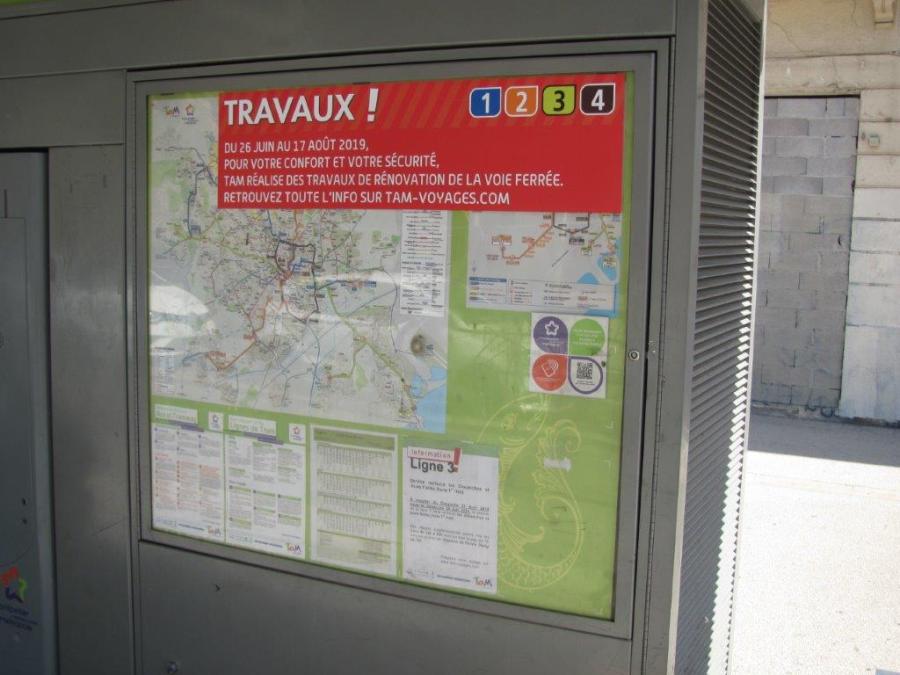 A la station « Saint-Denis » de la ligne 3, quai directions « Pérols – Etang de l’Or » et « Lattes Centre », l’information travaux masque partiellement le plan du réseau bus et tramways TaM Montpeliler 3M et les deux tiers du plan schématique du réseau de tramways. Photo prise le samedi 29 juin 2019. Copyright : Edouard Paris