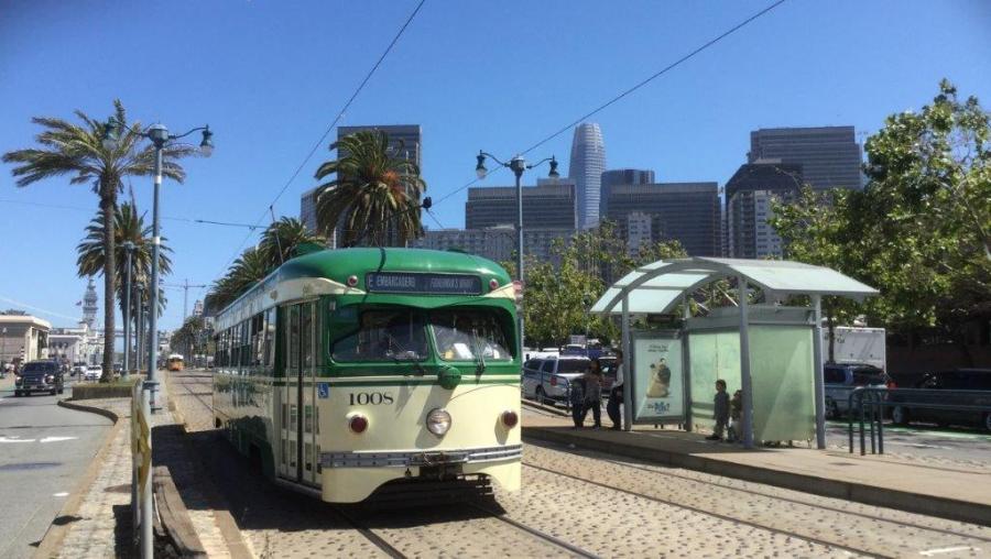 A San Francisco, la motrice PCC « Big Ten » Class numérotée 1008 revêtue de la livrée des années 50 San Francisco Municipal Railway, opérant sur la ligne E en direction de « Fisherman’s Wharf », est photographiée le dimanche 23 juin 2019 à la hauteur de la station « Green Street & The Embarcadero », commune aux lignes E et F, quai directions « Mission Bay » et « Market Street – Castro ». Copyright : Karine D