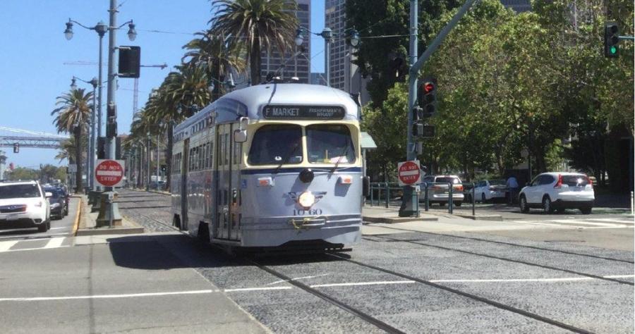 A San Francisco, la motrice PCC 1050 Class numérotée 1060 revêtue de la livrée Philadelphia Rapid Transit Company, opérant sur la ligne F en direction de « Fisherman’s Wharf », est photographiée le dimanche 23 juin 2019 sur le tronc commun aux lignes E et F, au moment où elle va franchir le carrefour The Embarcadero & Broadway. Copyright : Karine D