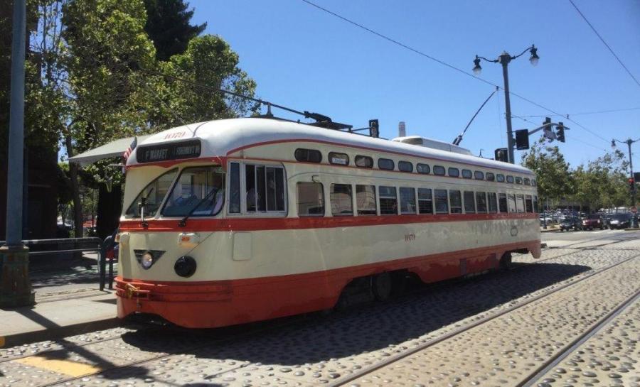 A San Francisco, la motrice PCC 1070 Class numérotée 1079 revêtue de la livrée Detroit, Michigan, opérant sur la ligne F en direction de « Market Street », est photographiée le dimanche 23 juin 2019, au moment où elle marque l’arrêt à la station « Broadway & The Embarcadero », commune aux lignes E et F, quai directions « Mission Bay » et « Market Street – Castro ». Copyright : Karine D