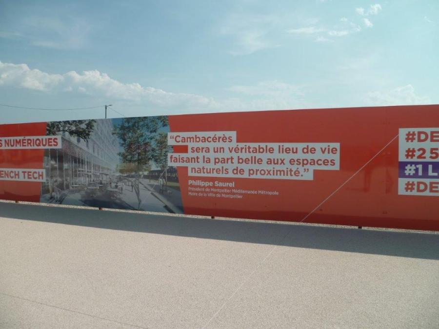 La phrase d’un pseudo visionnaire rattrapé par le retoquage des plans d’emplacement des logements de la ZAC Cambacérès à Montpellier. Photo prise le dimanche 7 juillet 2019. Copyright : Edouard Paris