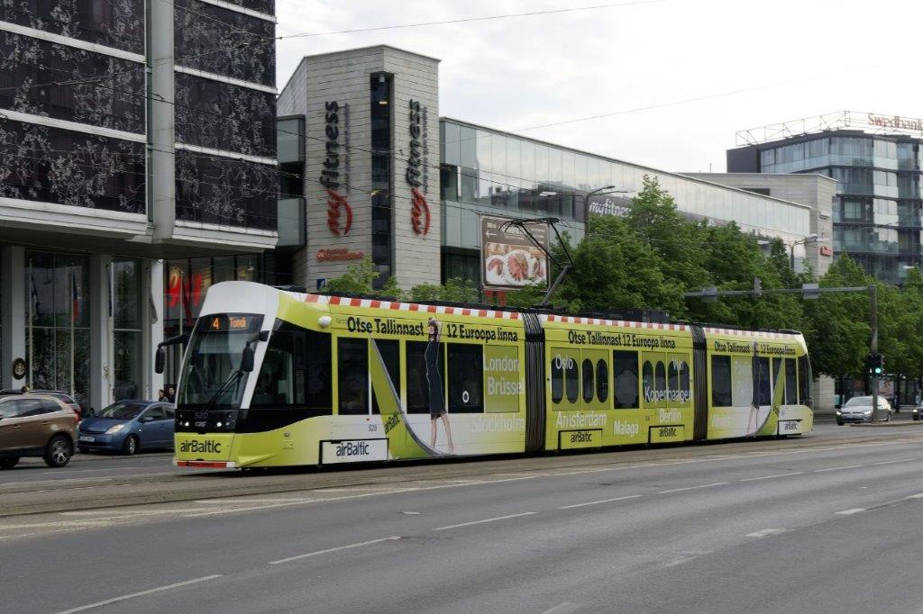 La rame 520 Urbos AXL CAF, opérant sur la ligne 4, au pelliculage publicitaire « airBaltic », est photographiée route de Varna, en centre-ville de Tallinn, tronc commun des quatre lignes du réseau de tramways de la capitale estonienne, le mardi 21 mai 2019. Copyright : Yvon Brument