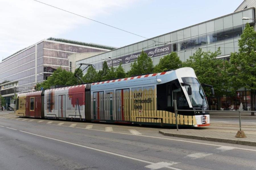 A Tallinn, la rame 518 Urbos AXL CAF (année 2015), opérant sur la ligne 4 et habillée d’une livrée publicitaire aux couleurs de la banque LHV, est photographiée route de Narva, en centre-ville, tronc commun des quatre lignes du réseau de tramways de la capitale estonienne, le mardi 21 mai 2019. Copyright : Yvon Brument