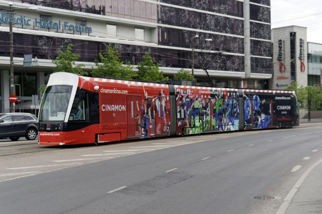 A Tallinn, la rame 501 Urbos AXL CAF (année 2014), opérant sur la ligne 4 et habillée d’une livrée publicitaire « Cinamonkino », est photographiée route de Narva, en centre-ville, tronc commun des quatre lignes du réseau de tramways de la capitale estonienne, le mardi 21 mai 2019. Copyright : Yvon Brument