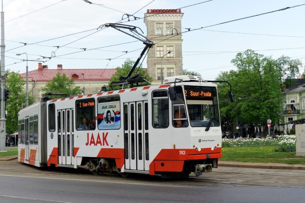 A Tallinn, la motrice triple caisse 110 KT6TM (année 1987), opérant sur la ligne 2 et arborant le prénom de Jaak, est photographiée place Viru, carrefour stratégique des quatre lignes du réseau de tramways de Tallinn, le mardi 21 mai 2019. Copyright : Yvon Brument