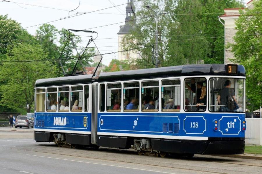 A Tallinn, la motrice double caisse 138 Tatra KT4TMR (année 1990 ex-réseau de Cottbus), opérant sur la ligne 3, est photographiée place Viru, en centre-ville, carrefour stratégique des quatre lignes de tramways de la capitale estonienne, le mardi 21 mai 2019. Copyright : Yvon Brument