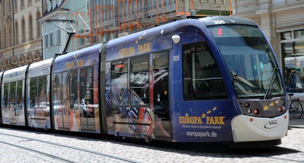 A Freiburg im Breisgau, la rame 305 Urbos 3 CAF, opérant sur la ligne 3, est photographiée sur la partie sud de Kaiser-Joseph-Strasse, le mardi 25 Juin 2019. Copyright : FraPom
