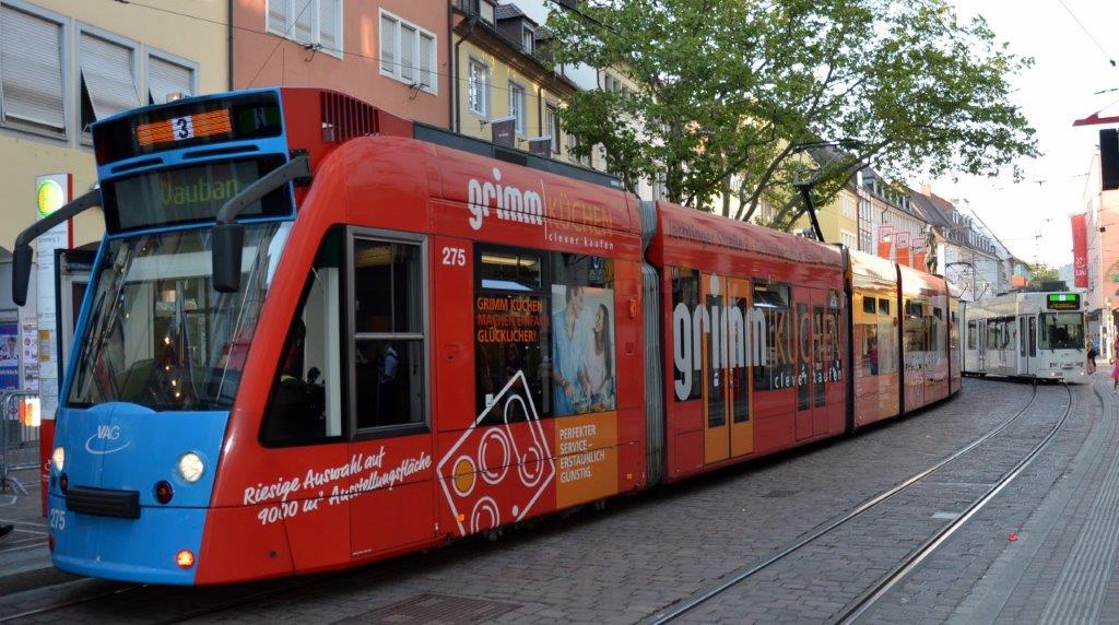 A Freiburg im Breisgau, la rame 275 Combino Basic Siemens, opérant sur la ligne 3, est photographiée sur Kaiser-Joseph-Strasse, le jeudi 27 juin 2019. Copyright : FraPom