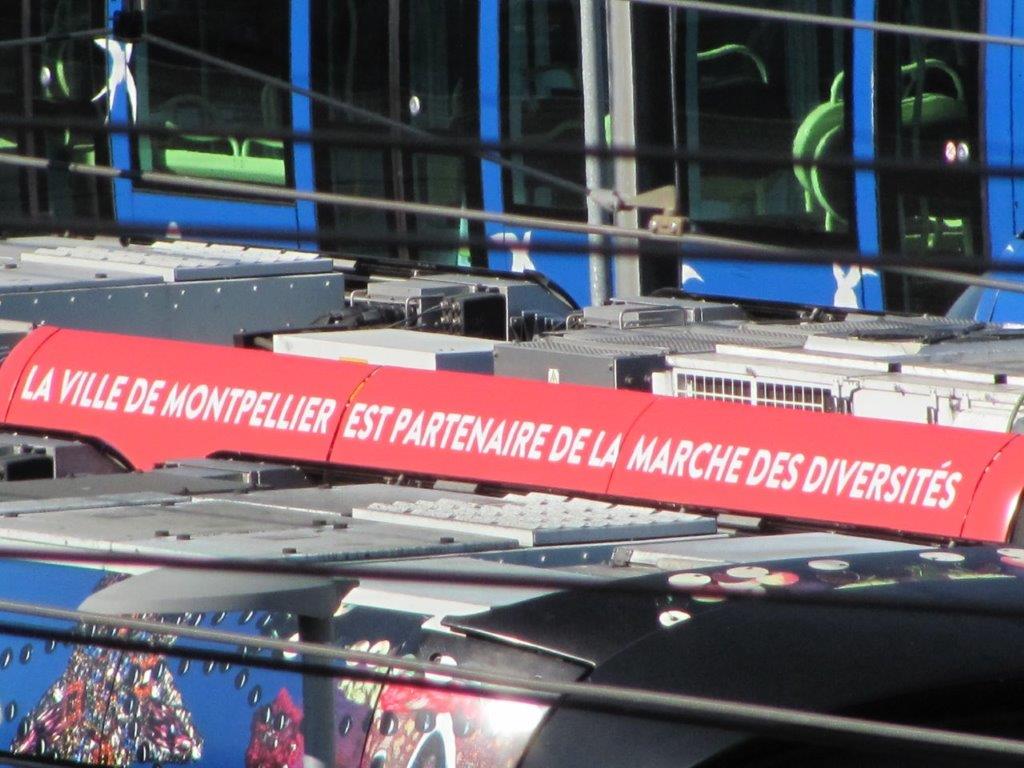 Le samedi matin 13 juillet 2019 à 9h32, la rame 2098 Citadis 402 Alstom multiligne, aux couleurs de la Marche des diversités, était garée sur une des voies du faisceau extérieur du centre d’exploitation et de maintenance « Les Hirondelles », quartier Mosson à Montpellier. Copyright : Edouard Paris