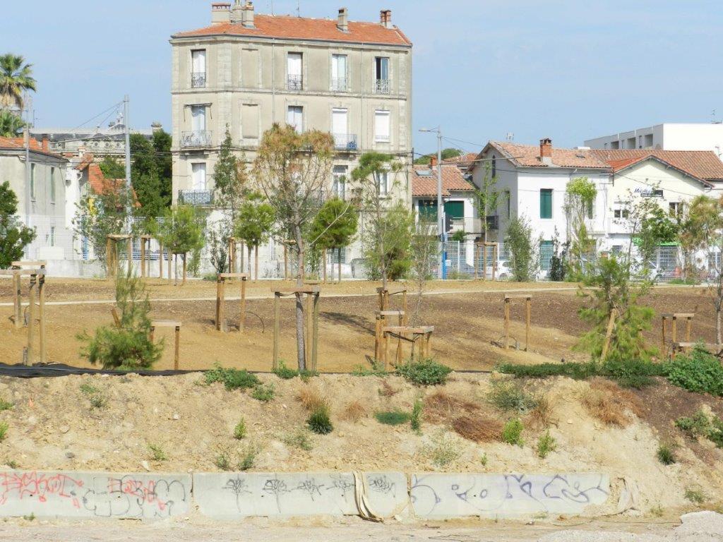 Futur parc René-Dumont à Montpellier, sur la photo, prise le dimanche 7 Juillet 2019, le faîte d’un arbre est totalement grillé, conséquence de l’épisode caniculaire du vendredi 28 juin 2019 après-midi. Copyright : Anje34